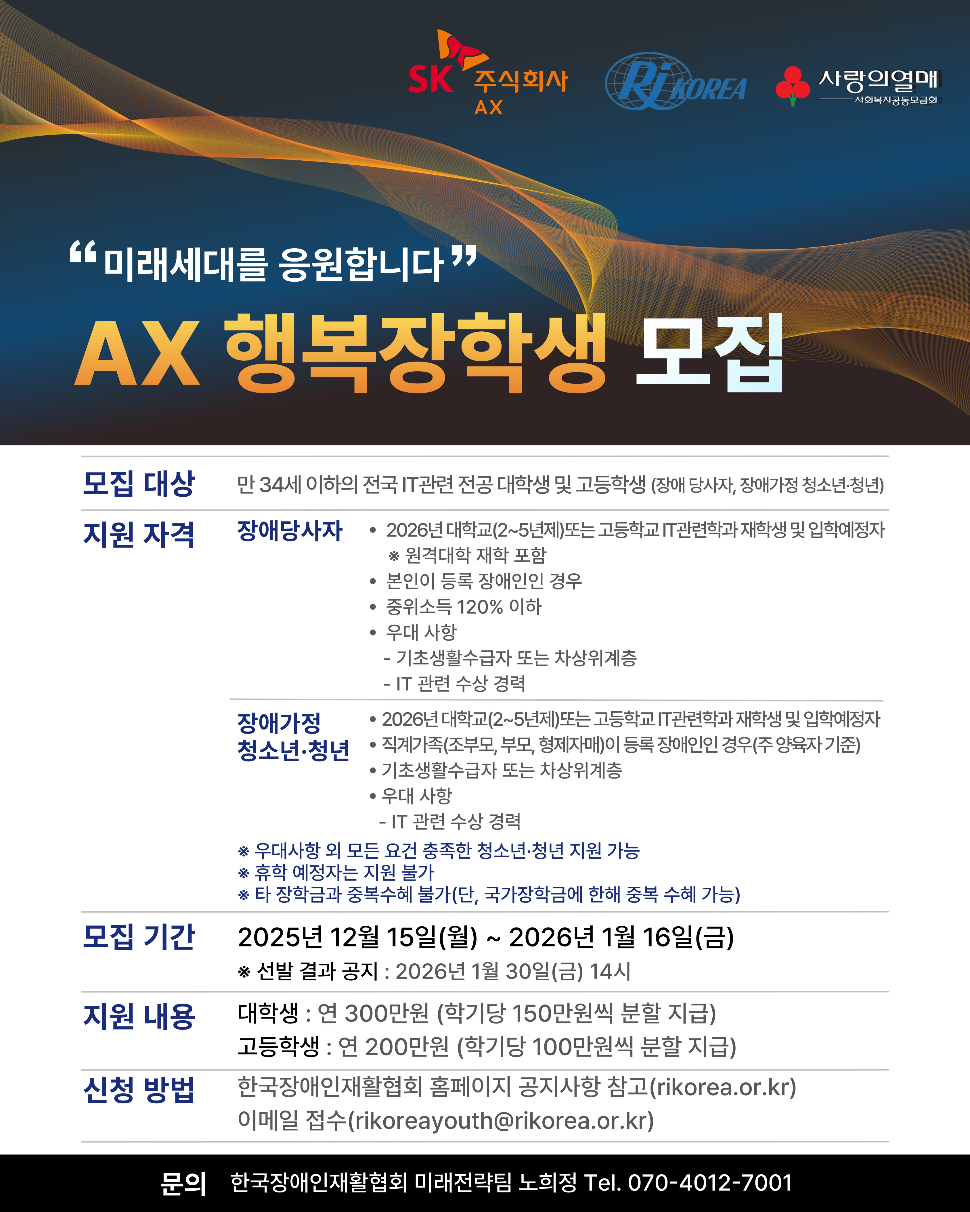 [한국장애인재활협회] 2026 SK(주) AX행복장학생 모집 안내(2026.1.16. 18:00)