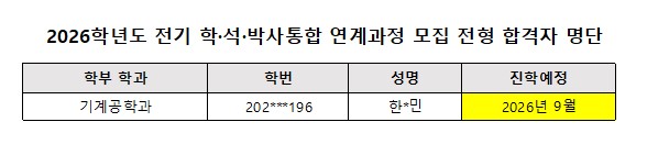 2026학년도 전기 학·석·박사통합 연계과정 모집 전형 합격자를 다음과 같이 공지합니다.