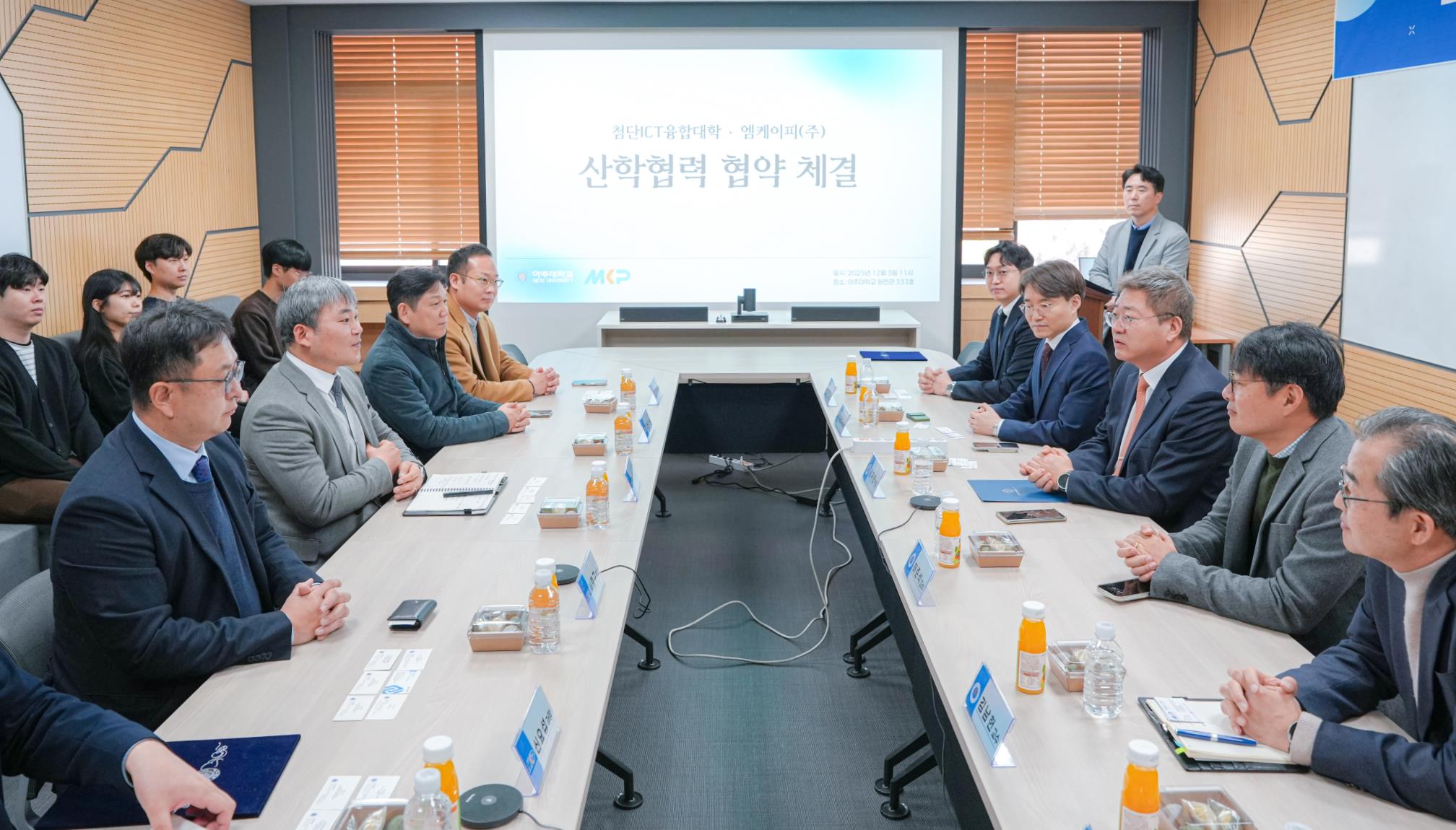 협약식은 3일 오전 아주대 원천관에서 진행됐다. 첨단ICT융합대학 김재현 학장과 지동우 지능형반도체공학과 학과장, 엠케이피 주식회사 전석환 대표와 박현수 상무를 비롯한 양측 관계자들이 참석했다.