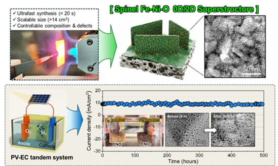 조인선 교수 연구팀의 솔-플레임 기법을 통한 Fe–Ni–O 스피넬 기반 0D/2D 초구조 촉매의